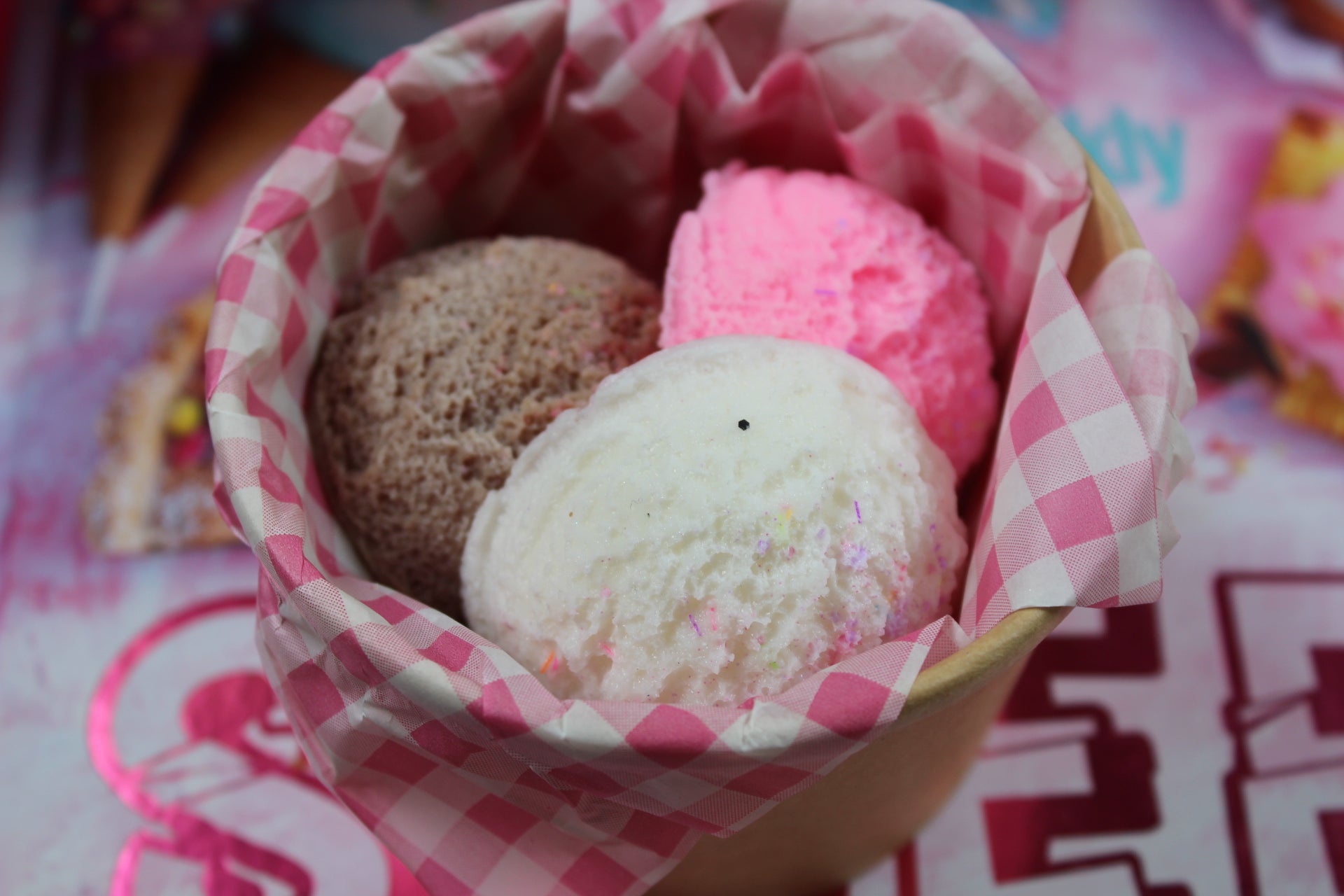 3 ice cream scoops in a bucket.