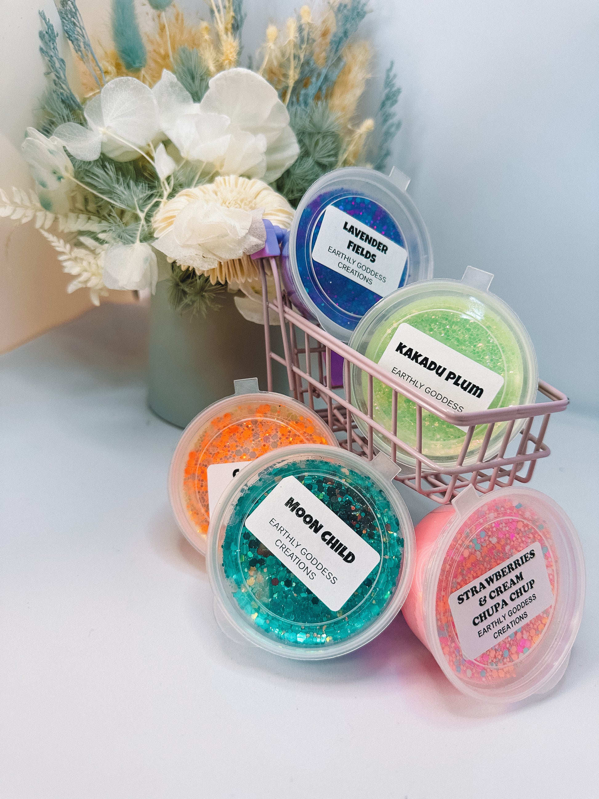 Coconut wax, premium fragrance, mica and wax dye chips, biodegradable glitter.